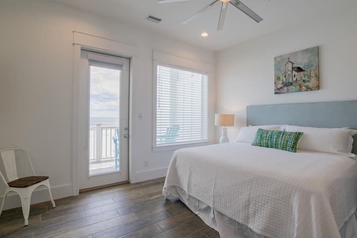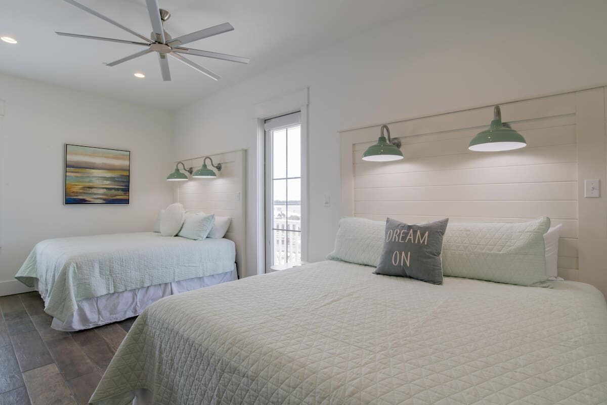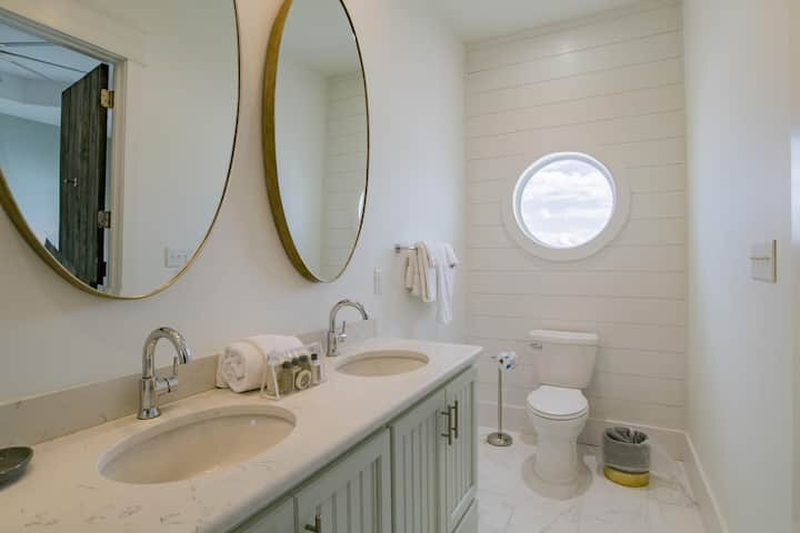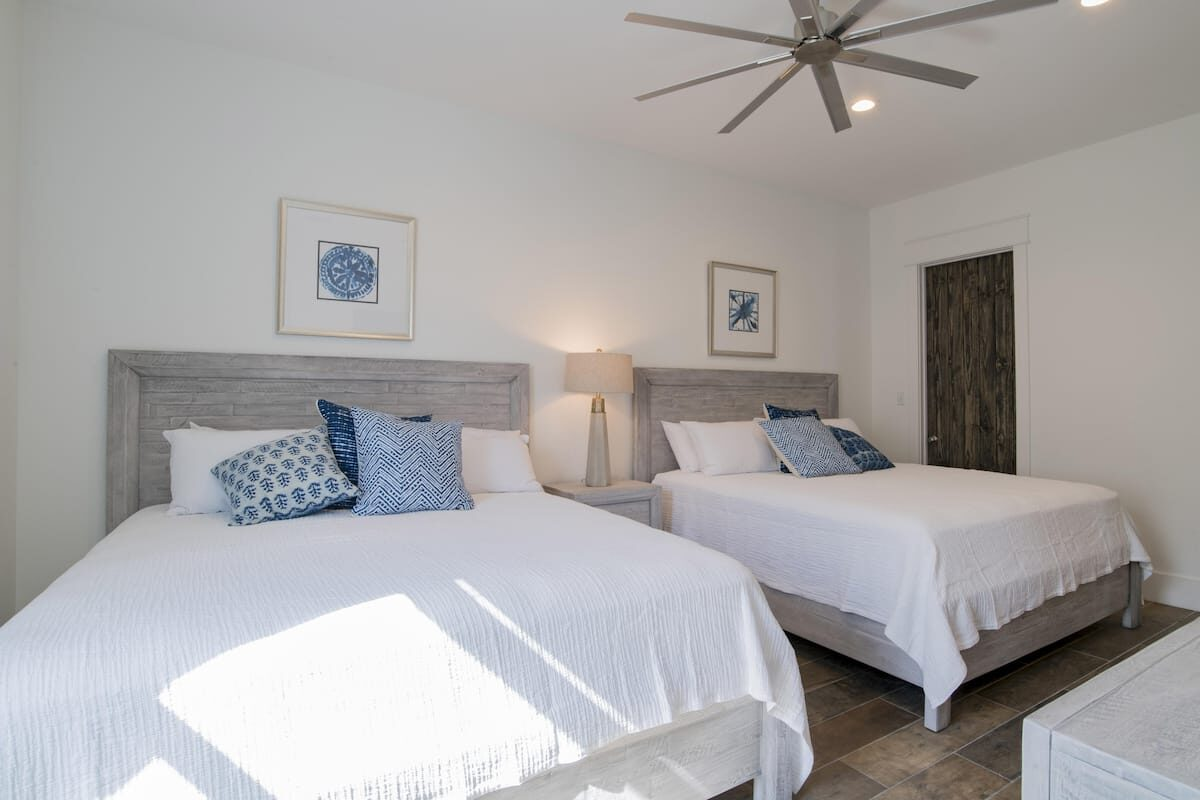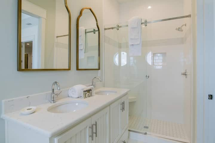 First Floor (sleeps up to 6): Southwest master bedroom with king-sized bed and private en-suite bathroom with roll-in shower. Northwest bedroom with 2 king-sized beds and private en-suite bathroom.
