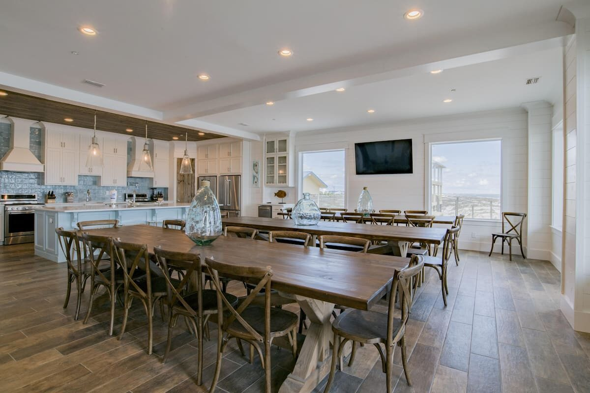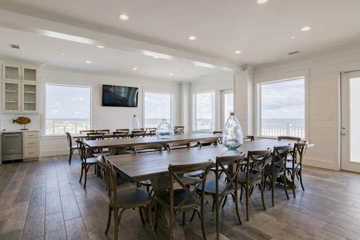 Enter a spacious Great Room with plush seating, a 75” Smart TV, high ceilings, and massive windows to fully immerse you in your Gulf-front experience. The nearby dining area features three 12-foot dining tables, so no one will be left out of the group feast. Another Smart TV (65”) in the dining area is great for slideshows or presentations (or watching the game while you eat).