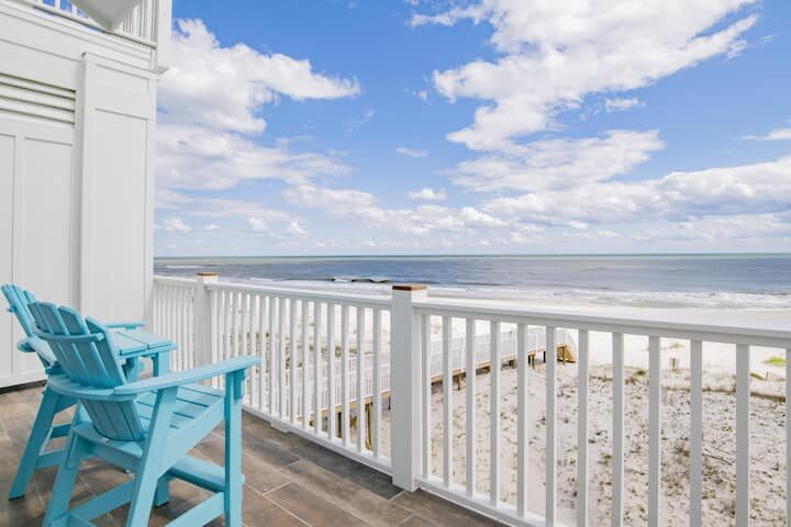 Steps away from the beach with a private boardwalk over the dunes. Accommodates up to 38 guests. Multiple private balconies, including 7 Gulf-front master balconies and 2 North-facing balconies with views of Little Lagoon. 12 bedrooms. 12 full bathrooms + 1 half bath (all bedrooms have their own full private bath). Elevator serves all 4 stories of the house. Private, waterfront, custom gunite swimming pool (option to heat for $35/day). High-end finishes throughout. Built-in stainless steel gas grill on Gulf-front deck (500-gallon tank in ground; no tanks to worry about refilling). Giant kitchen fully equipped with extra appliances. 3 refrigerators. 3 dishwashers. Multiple cooktops and 4 ovens. KitchenAid undercounter ice maker. Huge dining space with 3 custom-made tables that sit 12 people each (36 total!). Multiple Smart TVs throughout the house. WiFi boosters for each floor for excellent high-speed internet. 2 sets of full-sized washer/dryers (located on the middle and top floors). Parking spaces for all guests. Unobstructed panoramic views of the beach and to the East and West for miles. Proximity to shopping, the boating marina, and tons of beach activities.
