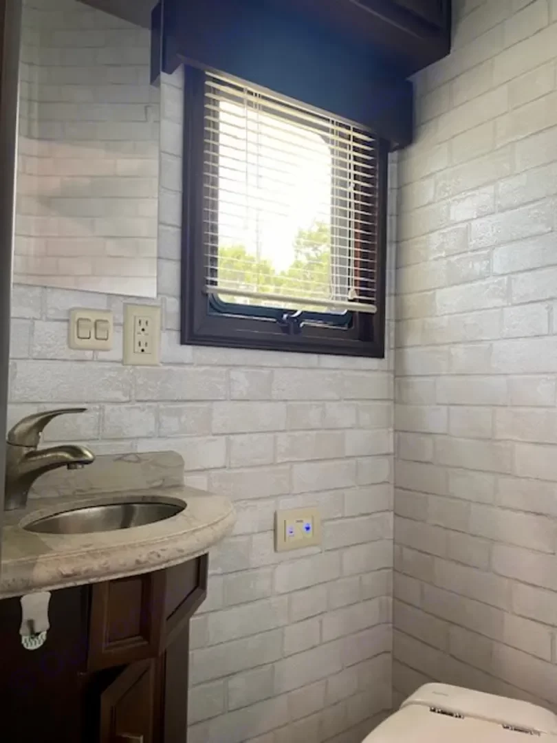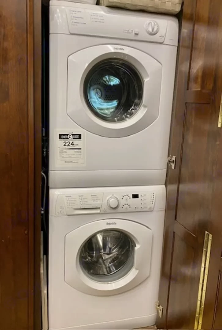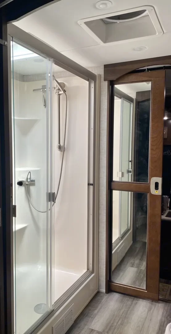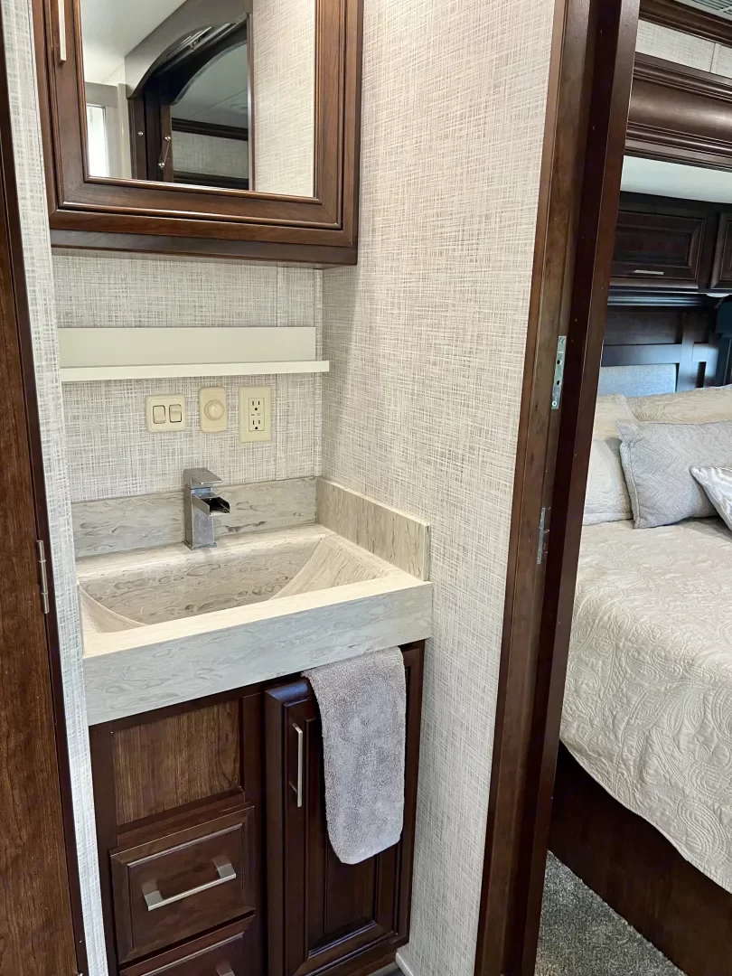 • Washer, dryer, premium king-size mattress, cedar closet, solid wood dresser, soft-close drawers, nightstands, private walk-in shower, large capacity hot water heater, private sinks and push-button power toilets, powered stowaway queen size bunk beds with ladder, overhead storage