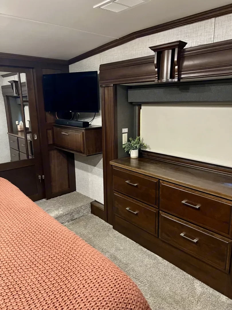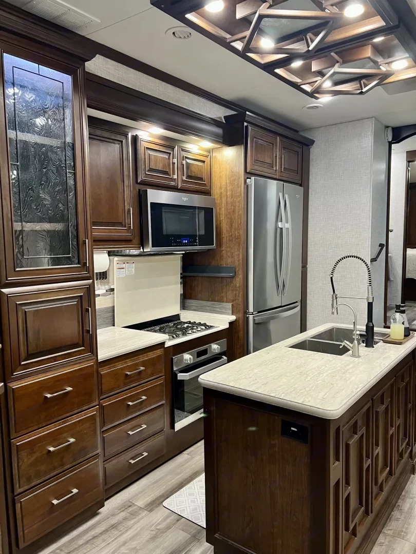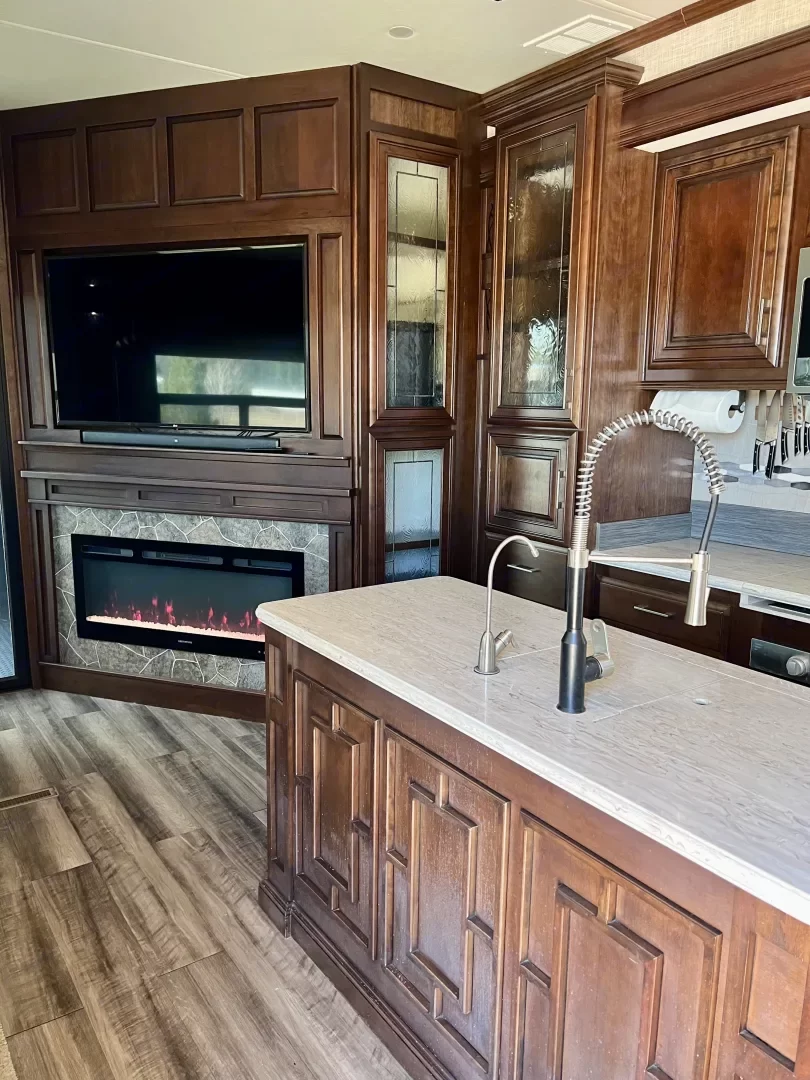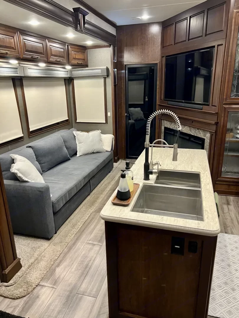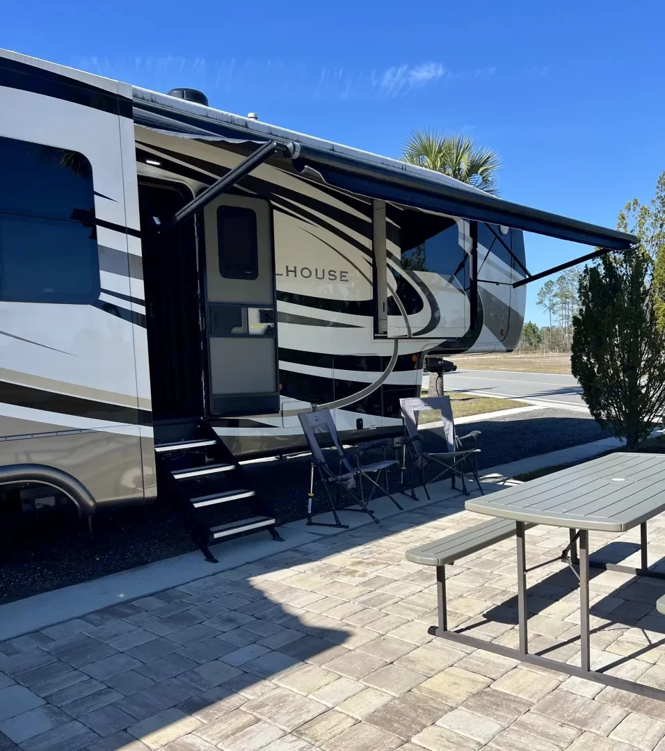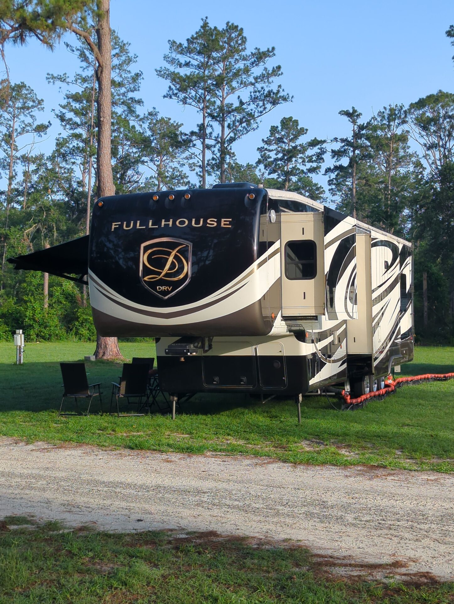 We are committed to a smooth and luxurious experience. So we keep it simple: One reasonable fee that covers transport delivery, setup, prep, a guided tour, and the “Johnson Clan Concierge” guarantee, then pickup, breakdown, restocking and sanitizing. Note that most RV Resorts welcome and accommodate RVs of this size. Just be sure to reconfirm the length & overhead requirements with your preferred resort at booking (see “Site Requirements” below).