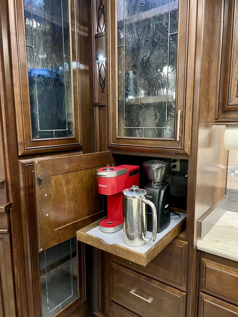 If you’re looking to “rough it,” look elsewhere. Welcome to prestige with your ultimate luxury Glamper, the “Royal Tent” of the camp! Spacious and elegant, this 45-foot beauty has 4 slide-outs, 2 separate sleeping areas, 1 ½ baths, and power everything. Avoid the usual inconveniences of camping so you can focus on building great memories with your family. Have a shower while running the washer and have hot water to spare. You may temporarily forget where you are until you smell the ocean air and feel the sun on your skin again, but you’ll be camping in style, sitting in a comfy chair on the back deck having a great cup of Joe.