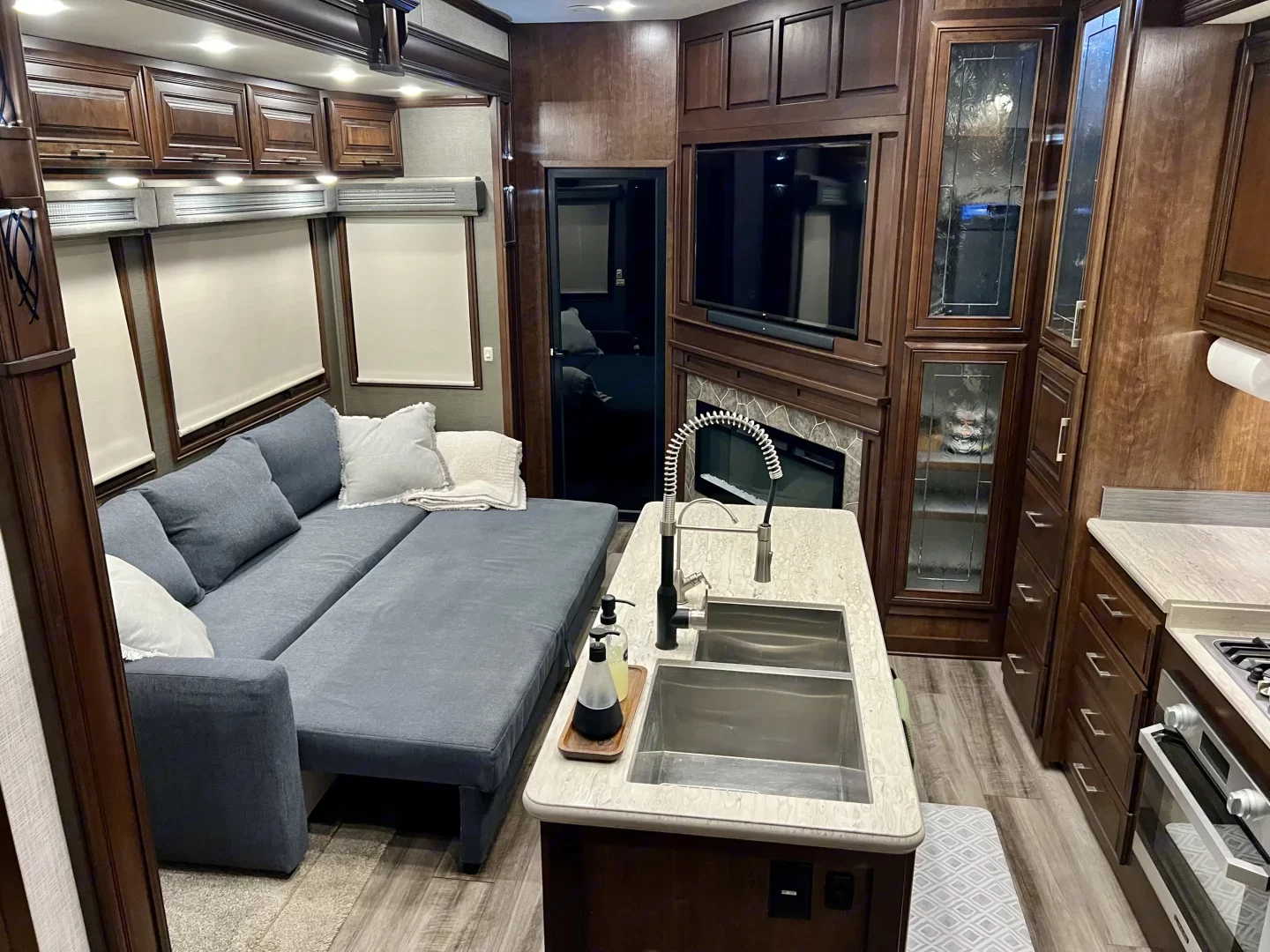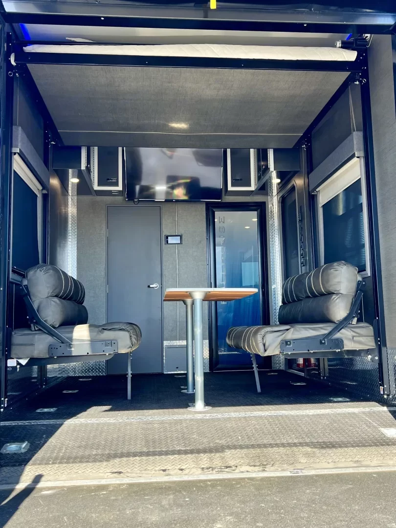 • Couch with recliners, three awnings, drop-down rear deck with railing, touchscreen entertainment system with premium outdoor speakers, 55” LG LED Smart TV in living room, LG LED TVs in garage and king suite, fancy lighting