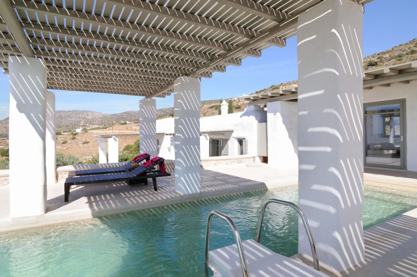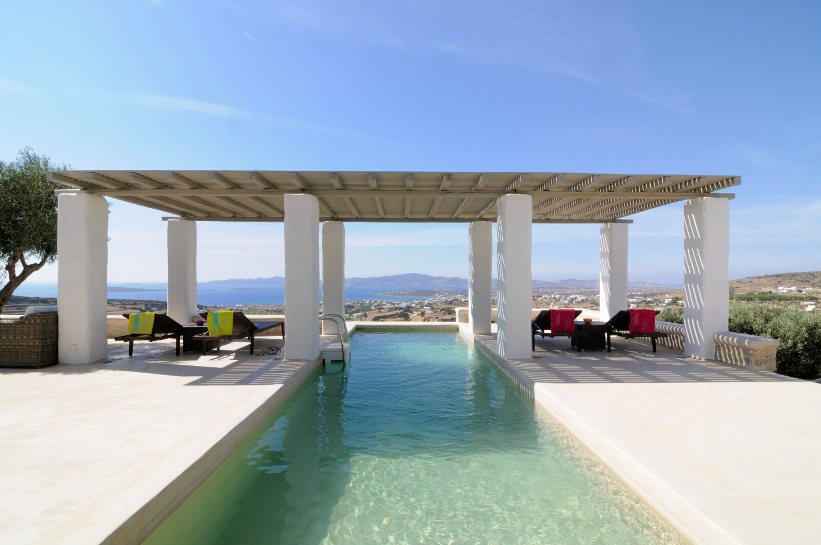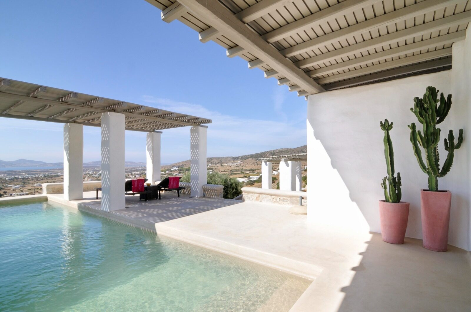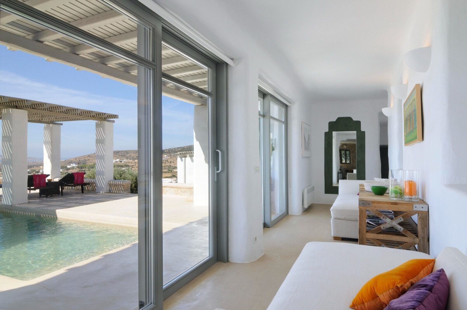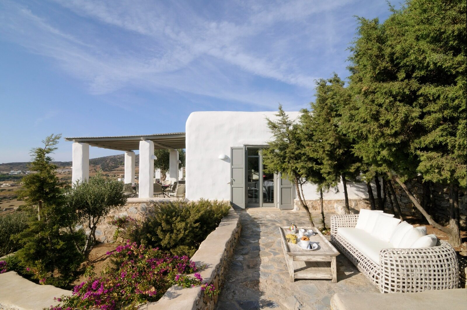 A beautiful private Greek villa perched above acres of olive yards, “Arktos” offers extensive colourful sea views over the islands of Antiparos. This exclusive villa of Cycladic archi­tecture is located in a privileged position over Agkeria bay. It enjoys extensive sea views and is blessed with colourful sun­sets, superb outlook and proximity to Farangas beach.