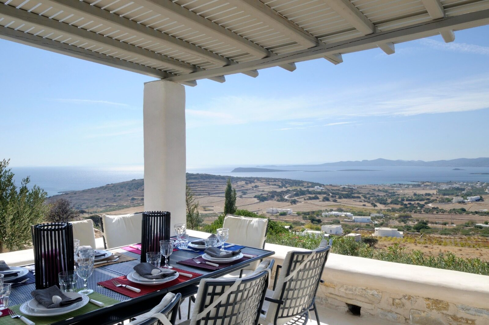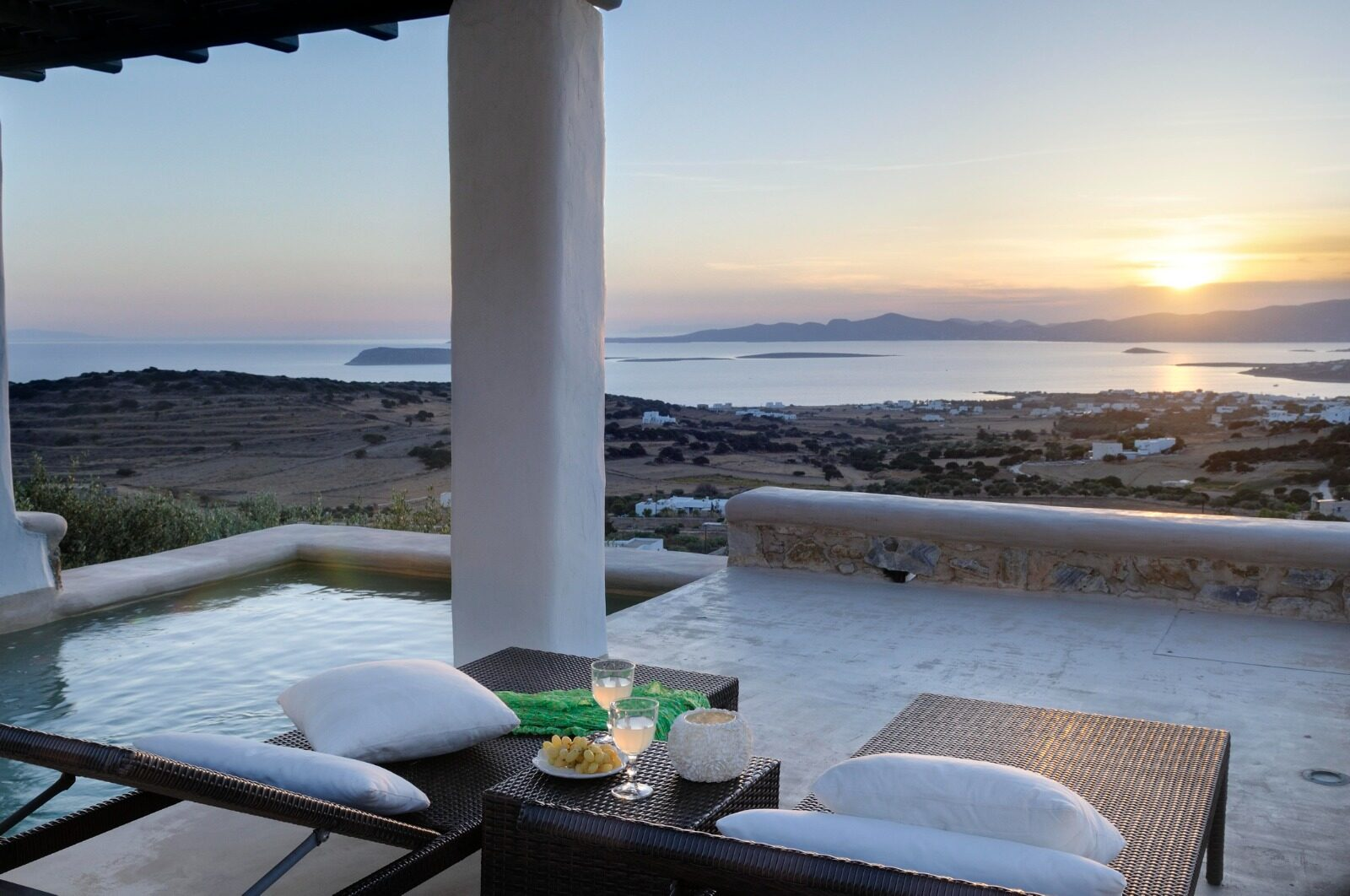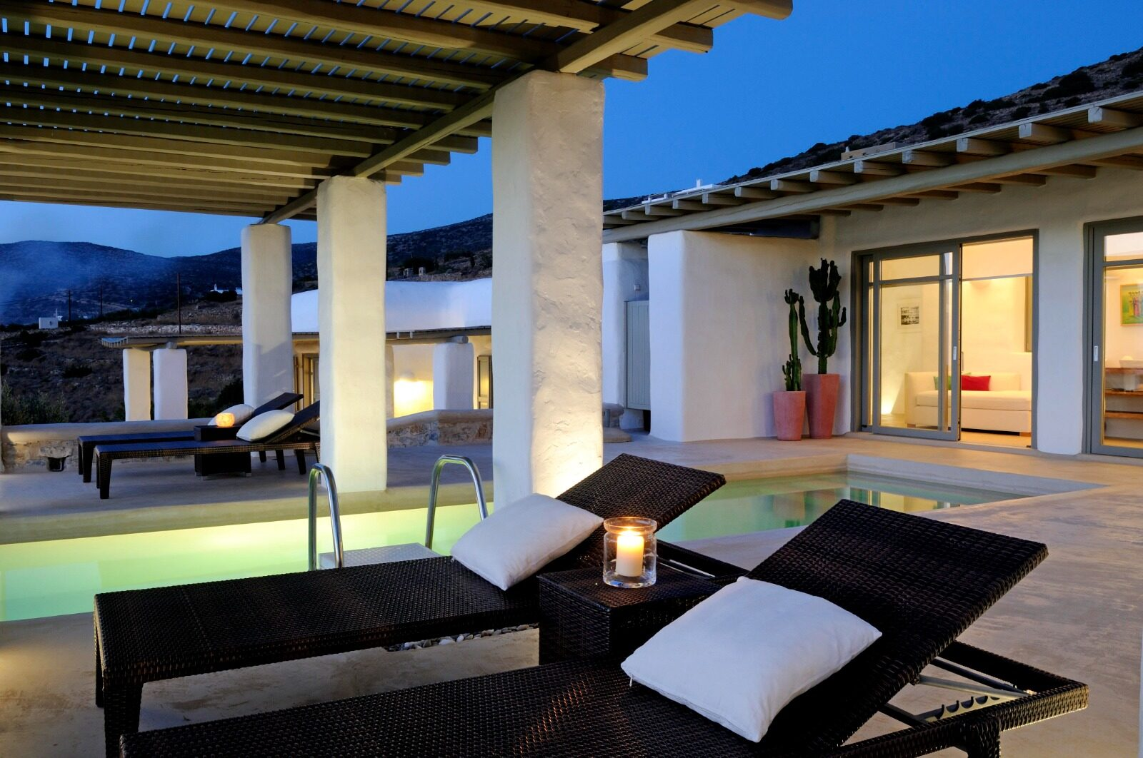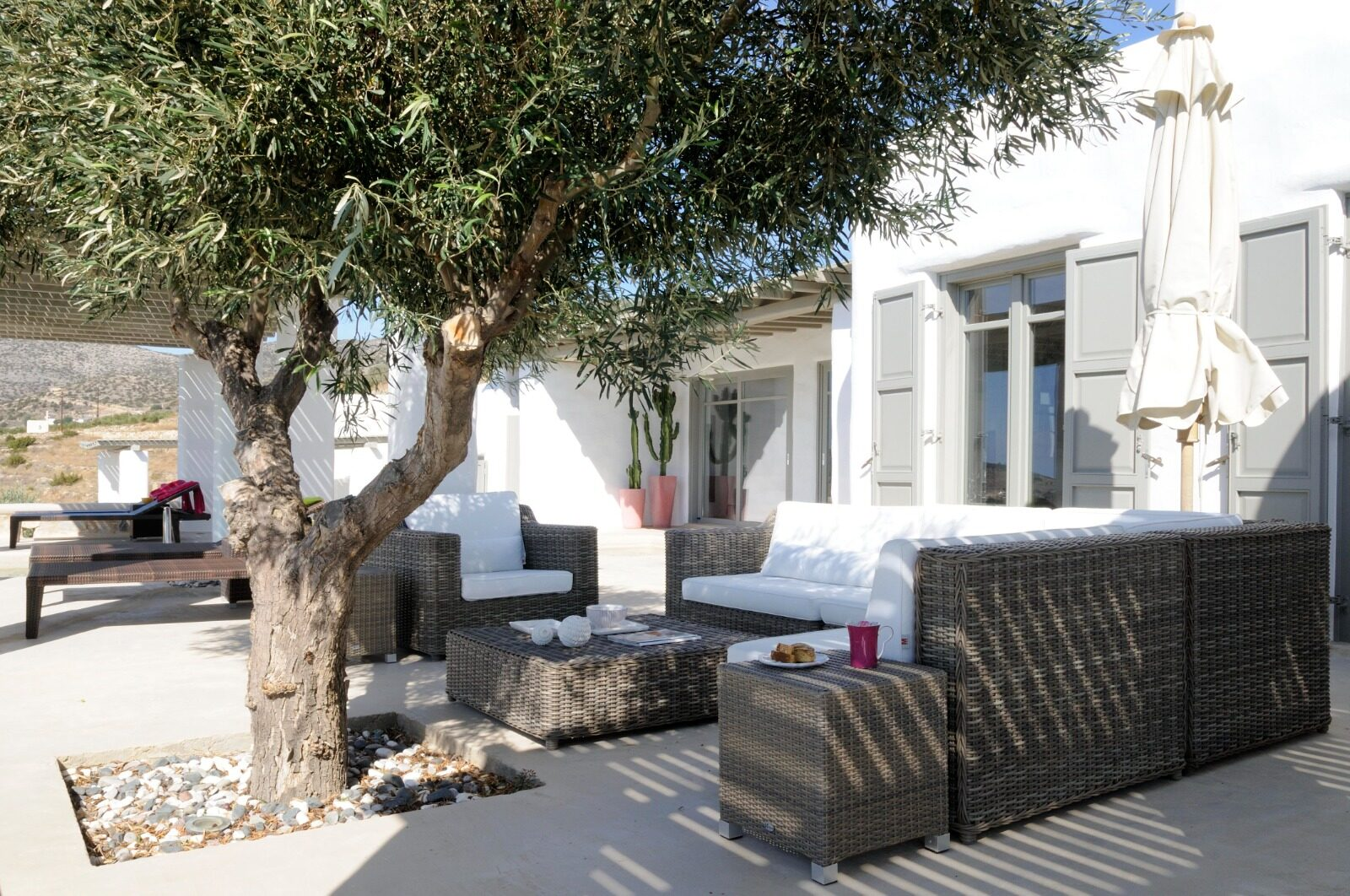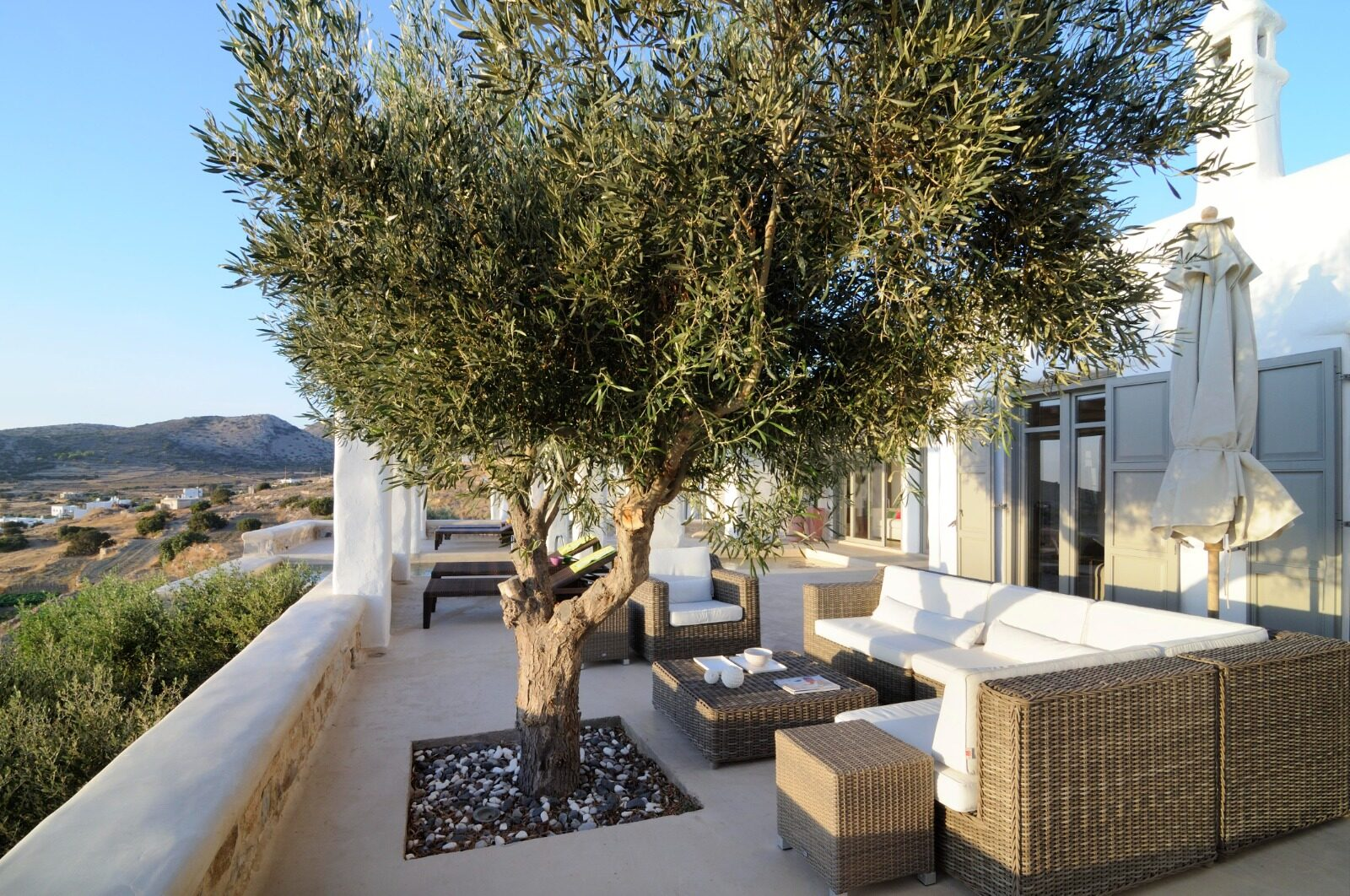 A beautiful private Greek villa perched above acres of olive yards, “Arktos” offers extensive colourful sea views over the islands of Antiparos. This exclusive villa of Cycladic archi­tecture is located in a privileged position over Agkeria bay. It enjoys extensive sea views and is blessed with colourful sun­sets, superb outlook and proximity to Farangas beach.