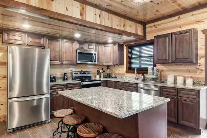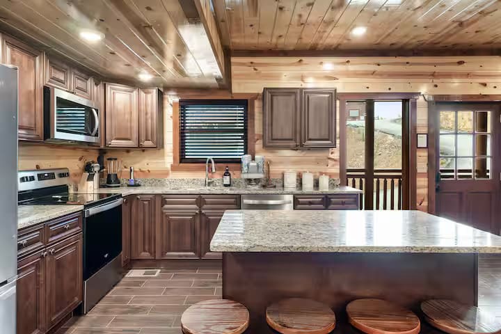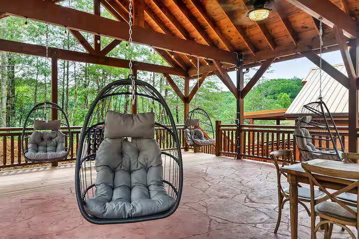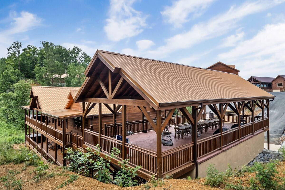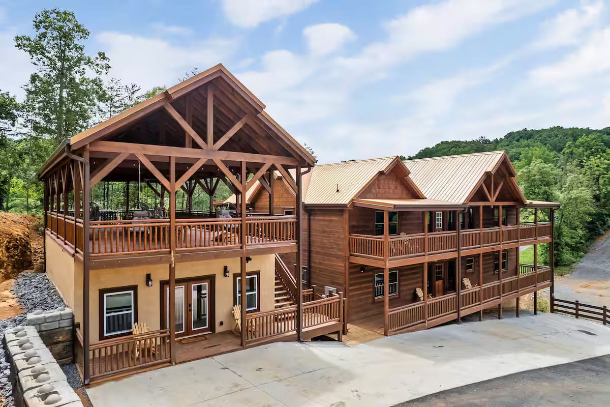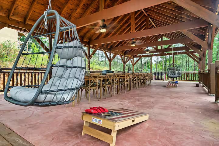 This exquisite cabin is the perfect getaway for large families or groups of friends! This 6000 sq. ft. home boasts a HUGE private pool, 10 bedrooms, 10.5 baths, a massive pavilion , a giant game room, TWO hot tubs and 5 decks with rocking chairs. With no steep hills.