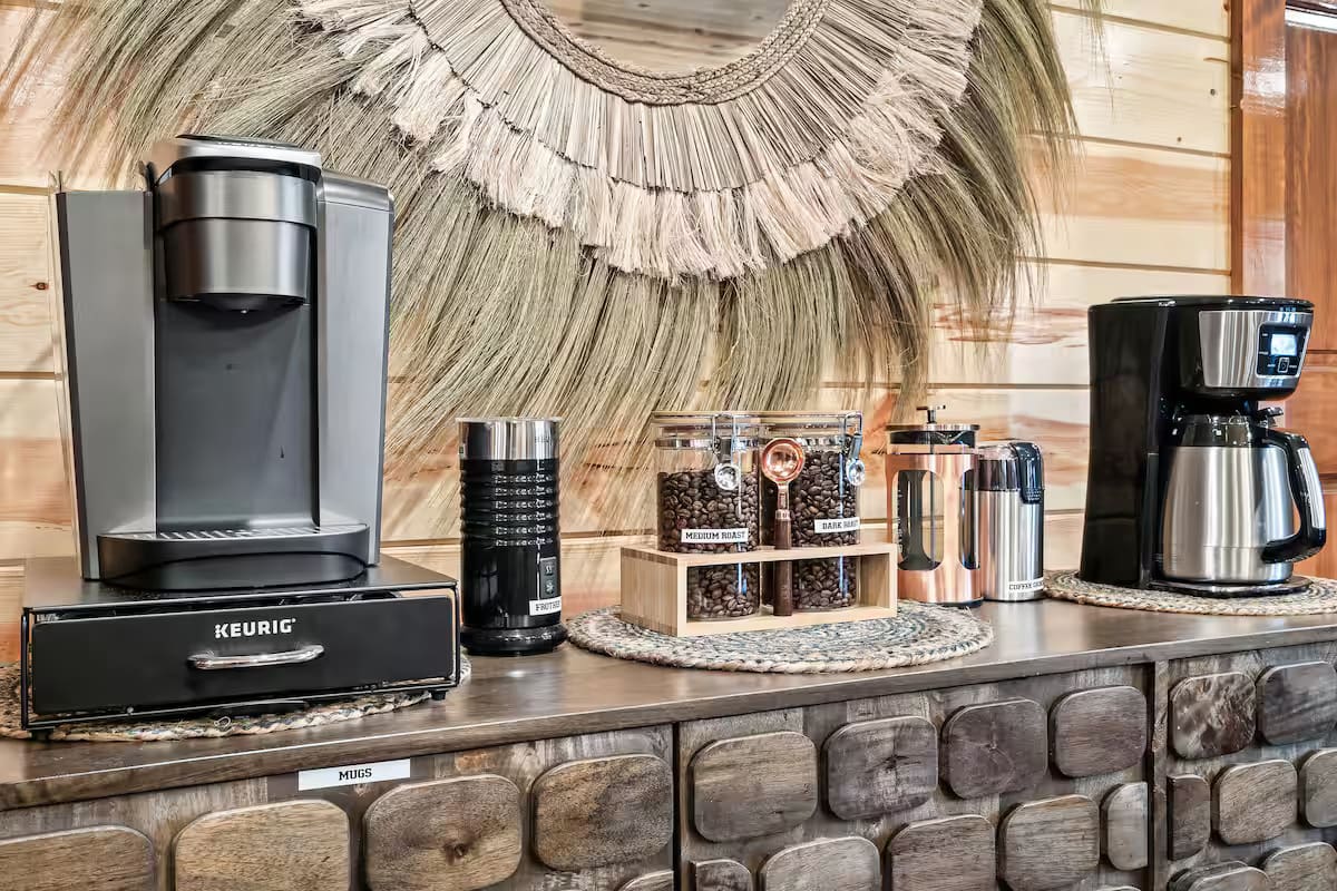 LUXURIOUS COFFEE BAR WITH KEURIG, FRENCH PRESS, GRINDER, FROTHER AND DRIP COFFEE