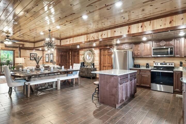 The large great room offers floor-to-ceiling windows to let all the natural light in. Cozy furniture and a luxurious fireplace make this room perfect for gathering the whole crew together for great conversation. The open floor plan creates a natural flow into the dining room with a large custom tree table for sit-down meals with seating for at least 12.