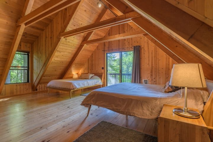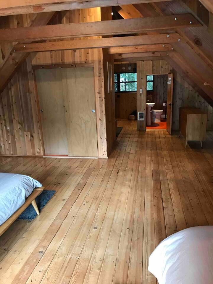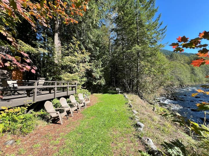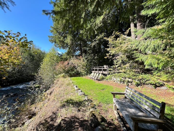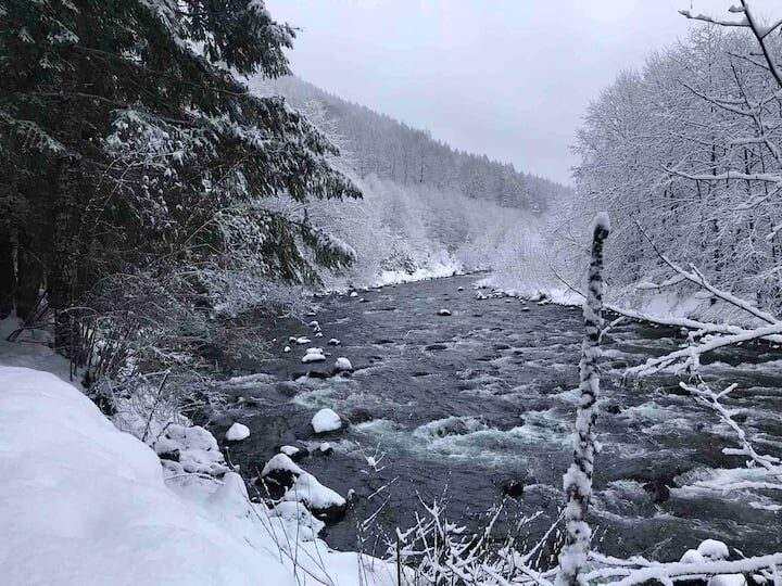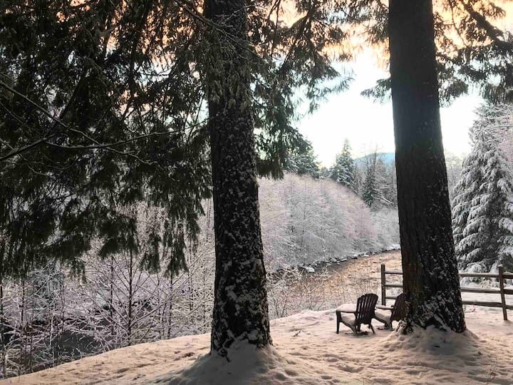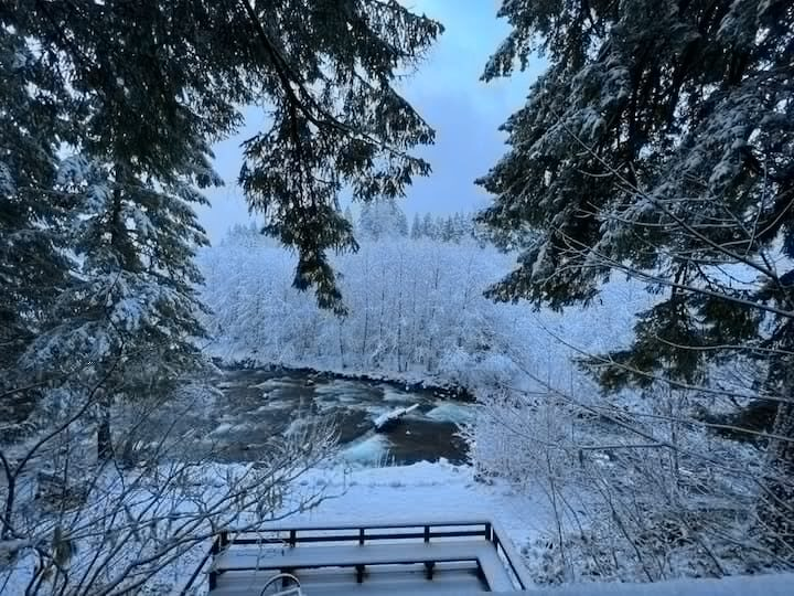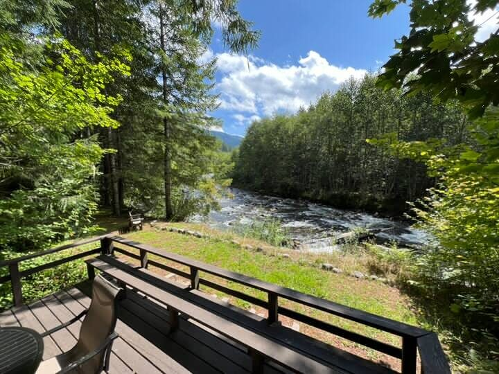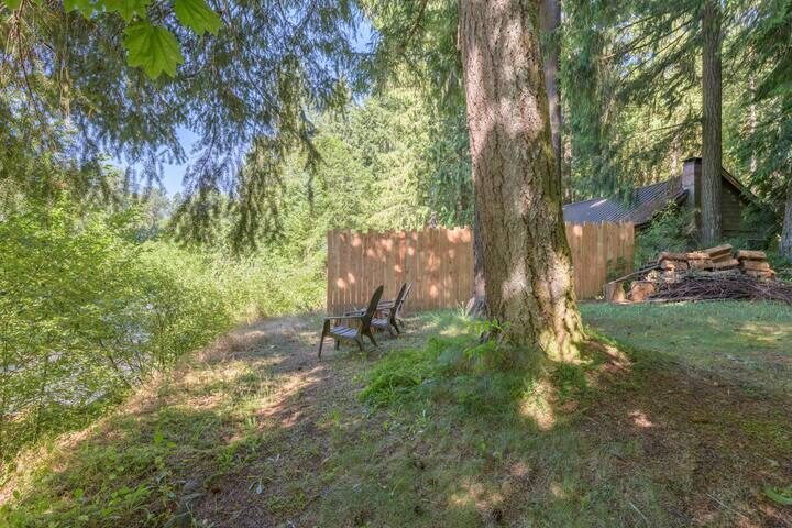 This cabin was handbuilt in 1973 by a Pacific Northwest stoneware artist and contains many special treatments throughout. Inside, there is plenty of seating downstairs – leather swivel chairs, one small sofa, a round 3-4 person table that overlooks the river and mountains, and a 12-foot long dining table. Heat is supplied via baseboard heaters downstairs and wall heaters upstairs. The cabin has Wifi, newer carpet, 55″ SmartTV , and a turntable with two boxes of vinyl. We also have a fully-stocked kitchen along with spices and condiments. The fireplace comes with an evenings worth of wood for $20 . More wood is available upon request.