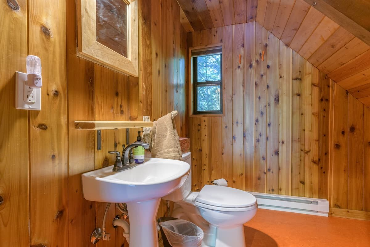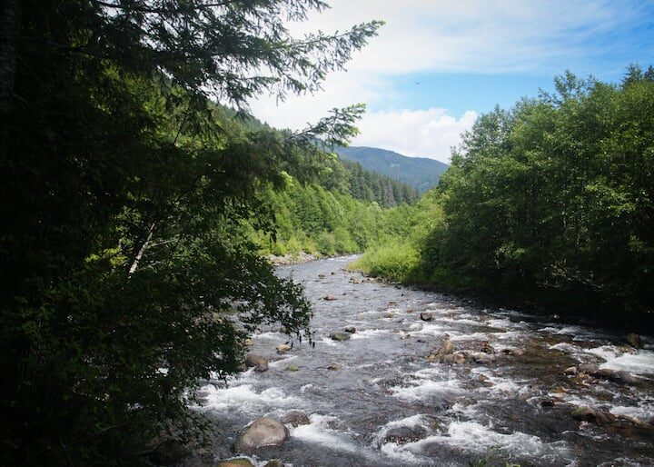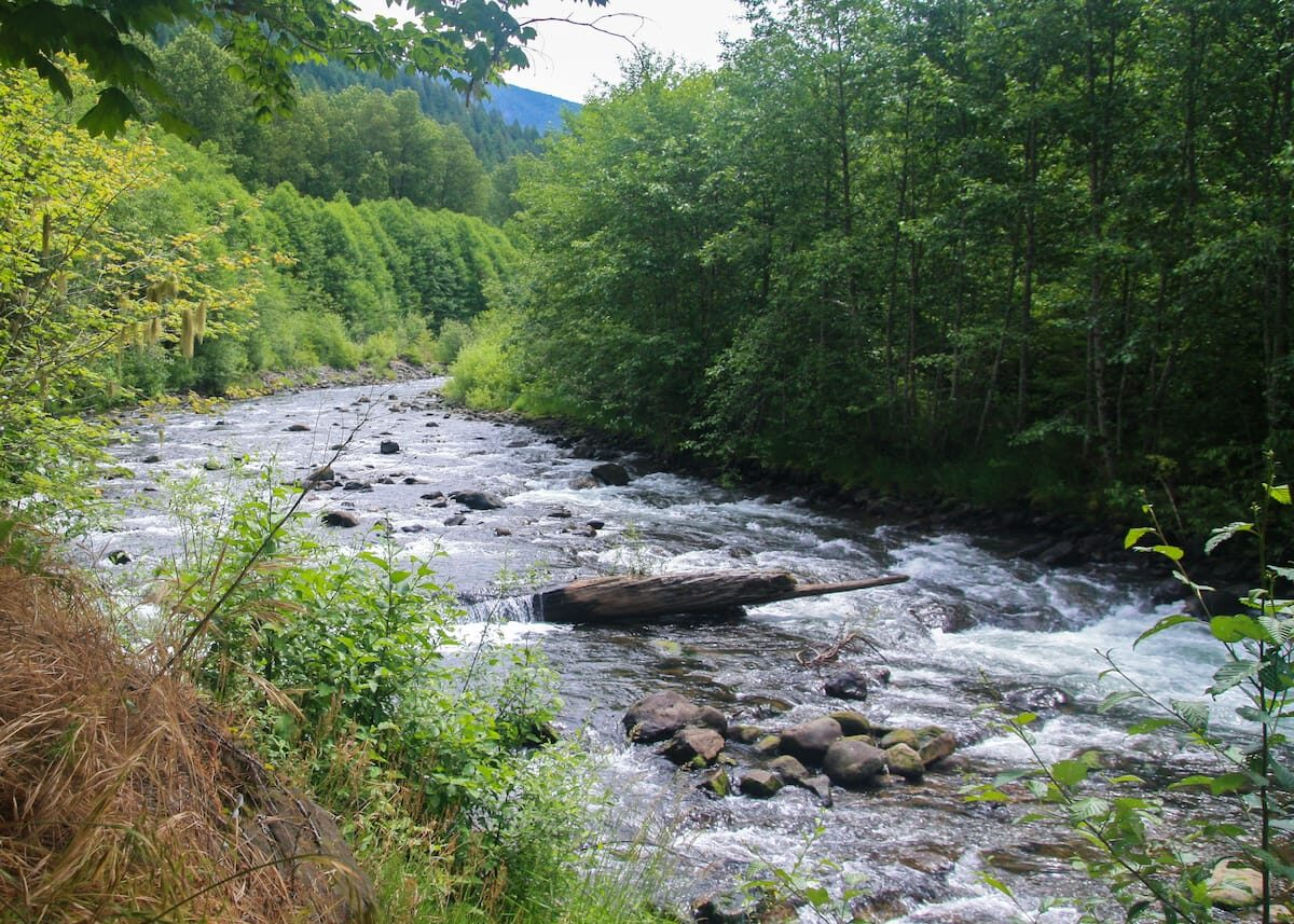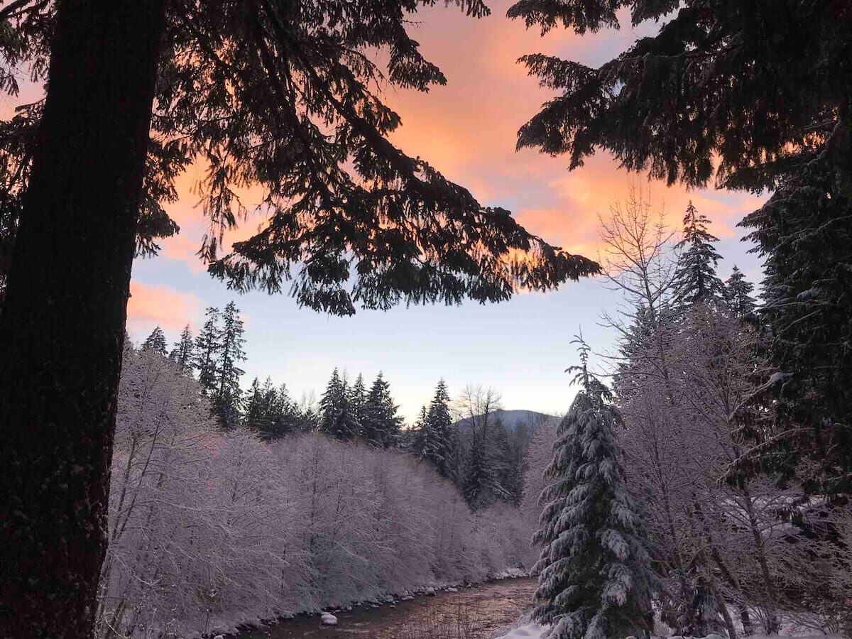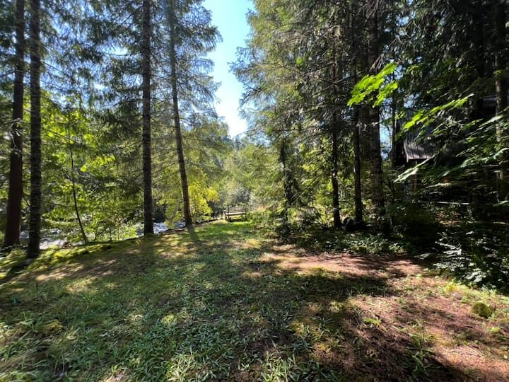 This cabin was handbuilt in 1973 by a Pacific Northwest stoneware artist and contains many special treatments throughout. Inside, there is plenty of seating downstairs – leather swivel chairs, one small sofa, a round 3-4 person table that overlooks the river and mountains, and a 12-foot long dining table. Heat is supplied via baseboard heaters downstairs and wall heaters upstairs. The cabin has Wifi, newer carpet, 55″ SmartTV , and a turntable with two boxes of vinyl. We also have a fully-stocked kitchen along with spices and condiments. The fireplace comes with an evenings worth of wood for $20 . More wood is available upon request.