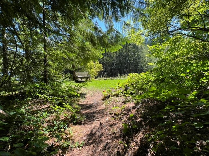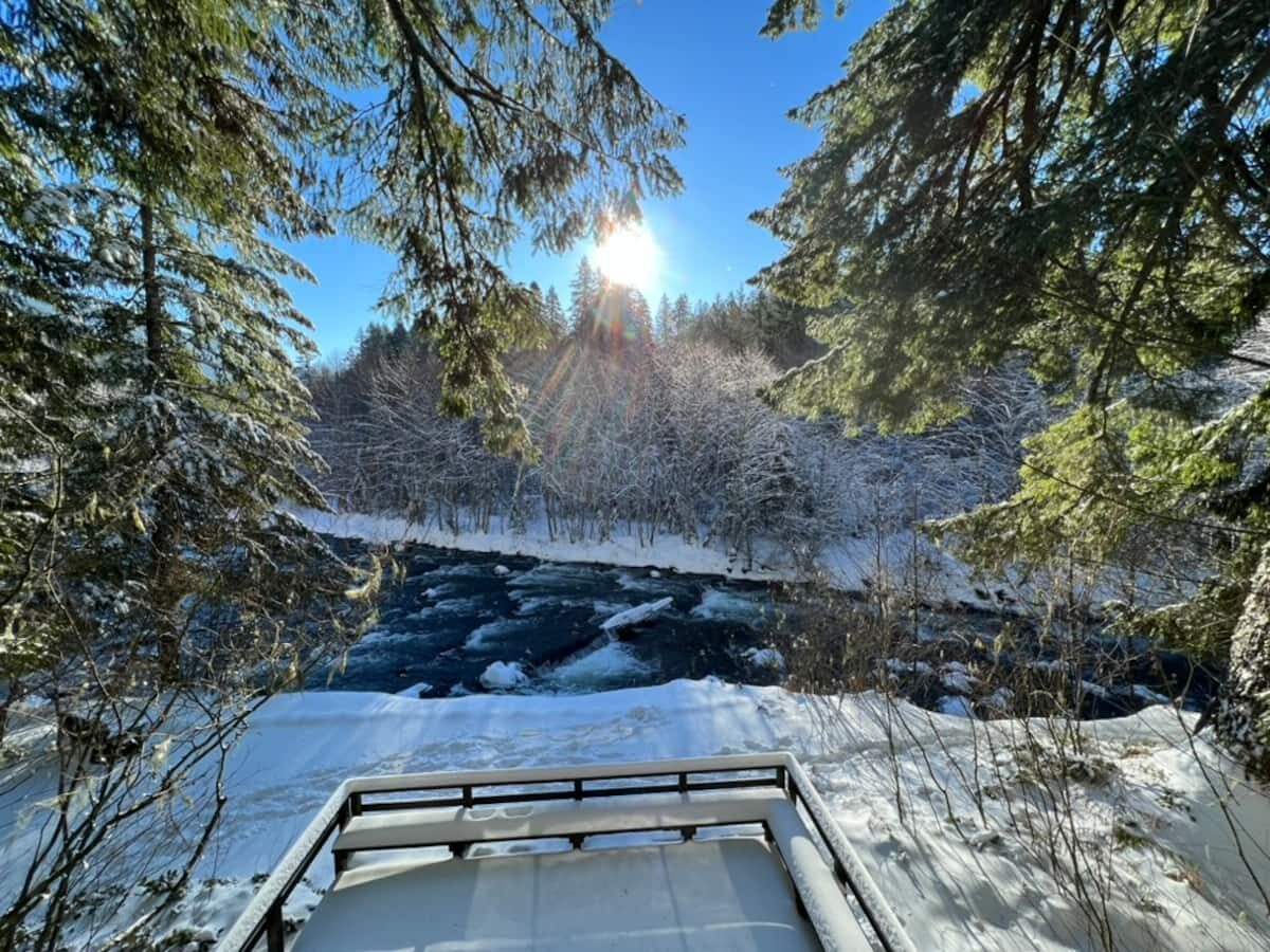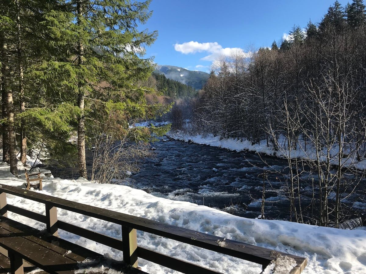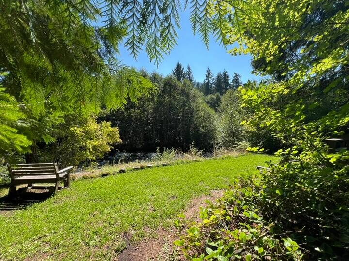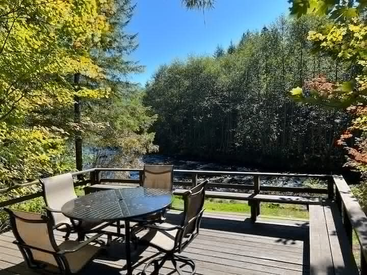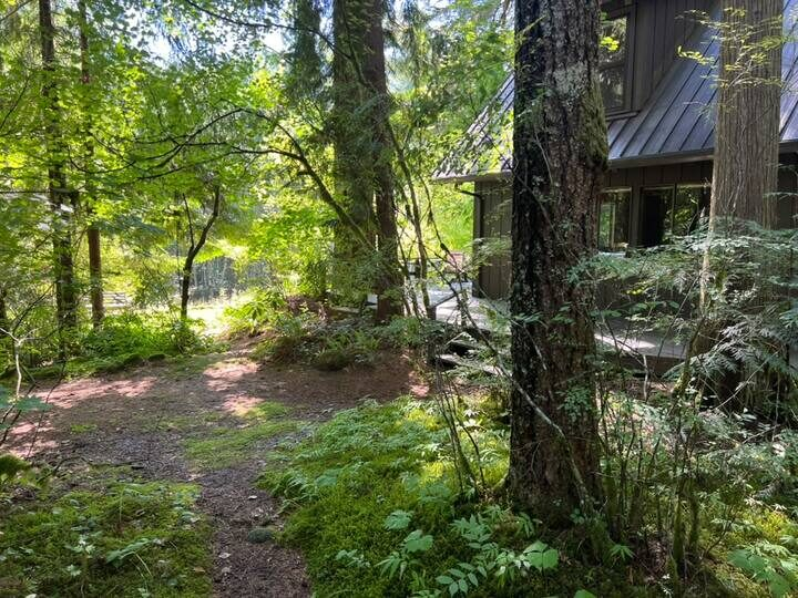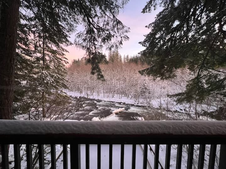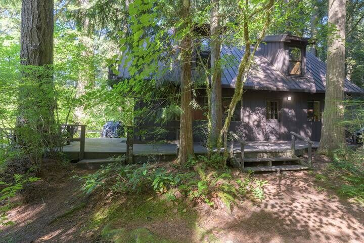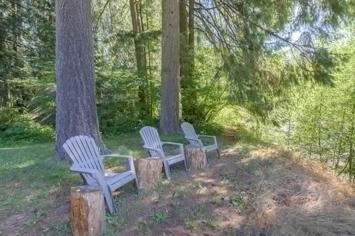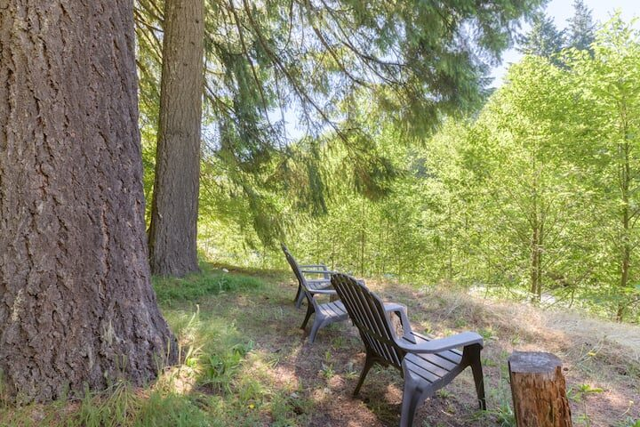 Outside, the Zig Zag River flows over rocks and a log that creates a natural fall, and the property is comprised of three lots with big trees and native plants and there are many “sit and relax” options. The upper deck, immediately outside of the bedroom loft, has a couple of chairs and amazing views. The lower deck has perimeter bench seating, a 4-person patio set, and a gas grill. At different points along the river are a hammock (in summer), gliding bench, and moveable chairs. If you want to go for a stroll, there is a path leading east (upstream) from the property that enters the Mt. Hood National Forest and has direct access to the clean running Zig Zag River. Downstream a few hundred yards is the confluence of the Zig Zag and Sandy Rivers, and you can access the river by foot and witness the silty Sandy mix with the clear Zig Zag; it’s quite a natural spectacle.