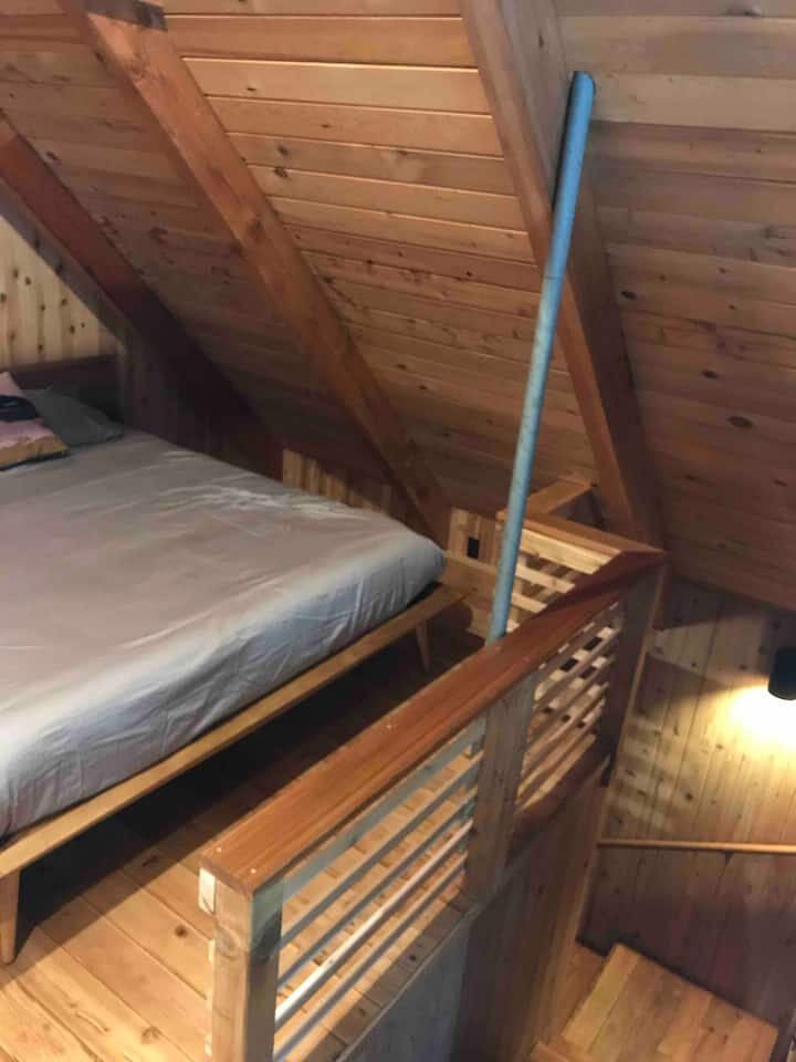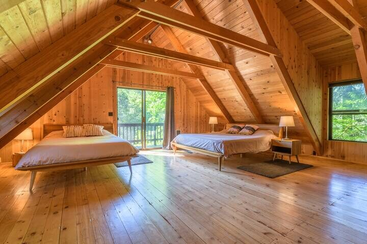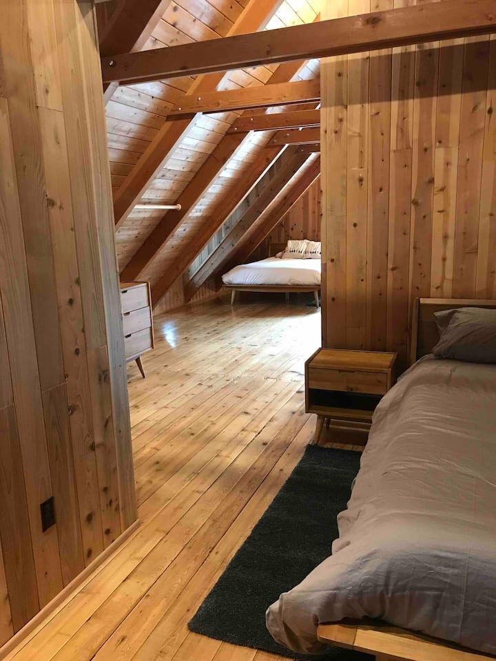 The large, dorm-style bedroom is upstairs and provides little privacy. As seen in the photos, the queen and one king are directly across from each other, but the king by the stairs does have a bit of visual privacy by way of a partial wall.