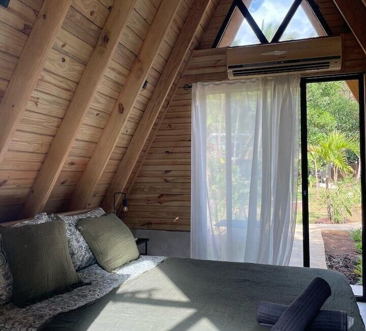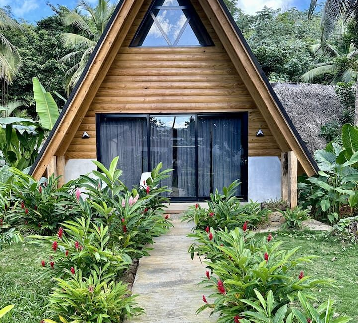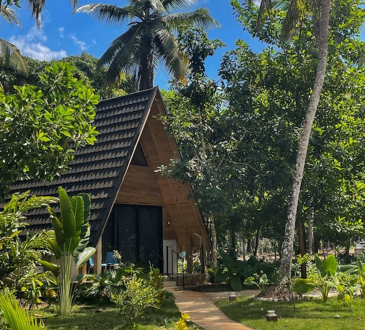 Welcome to your secluded slice of paradise nestled amidst lush jungle foliage, just a short stroll away from the serene beach on the tranquil bay. This charming A-frame cabin boasts a cozy one-bedroom layout complete with a full kitchen, bathroom, living room and dining space. Surrounded by towering coconut trees...